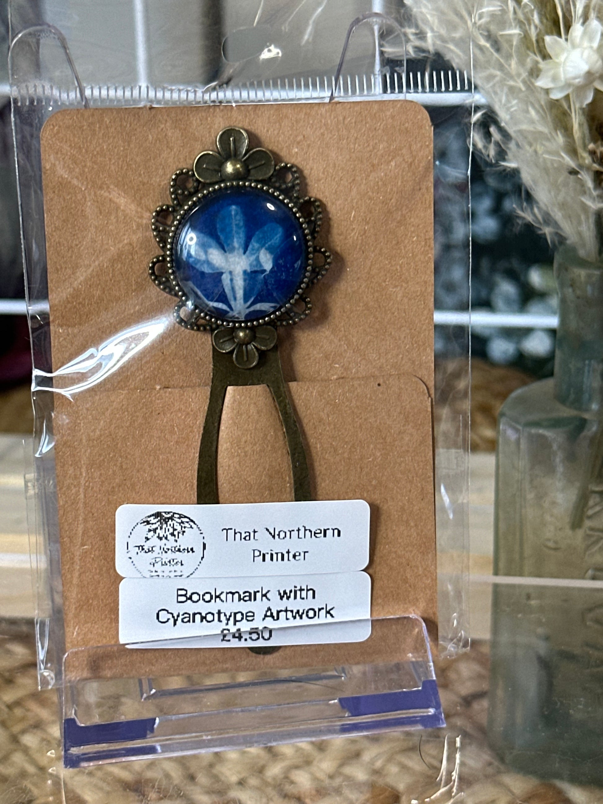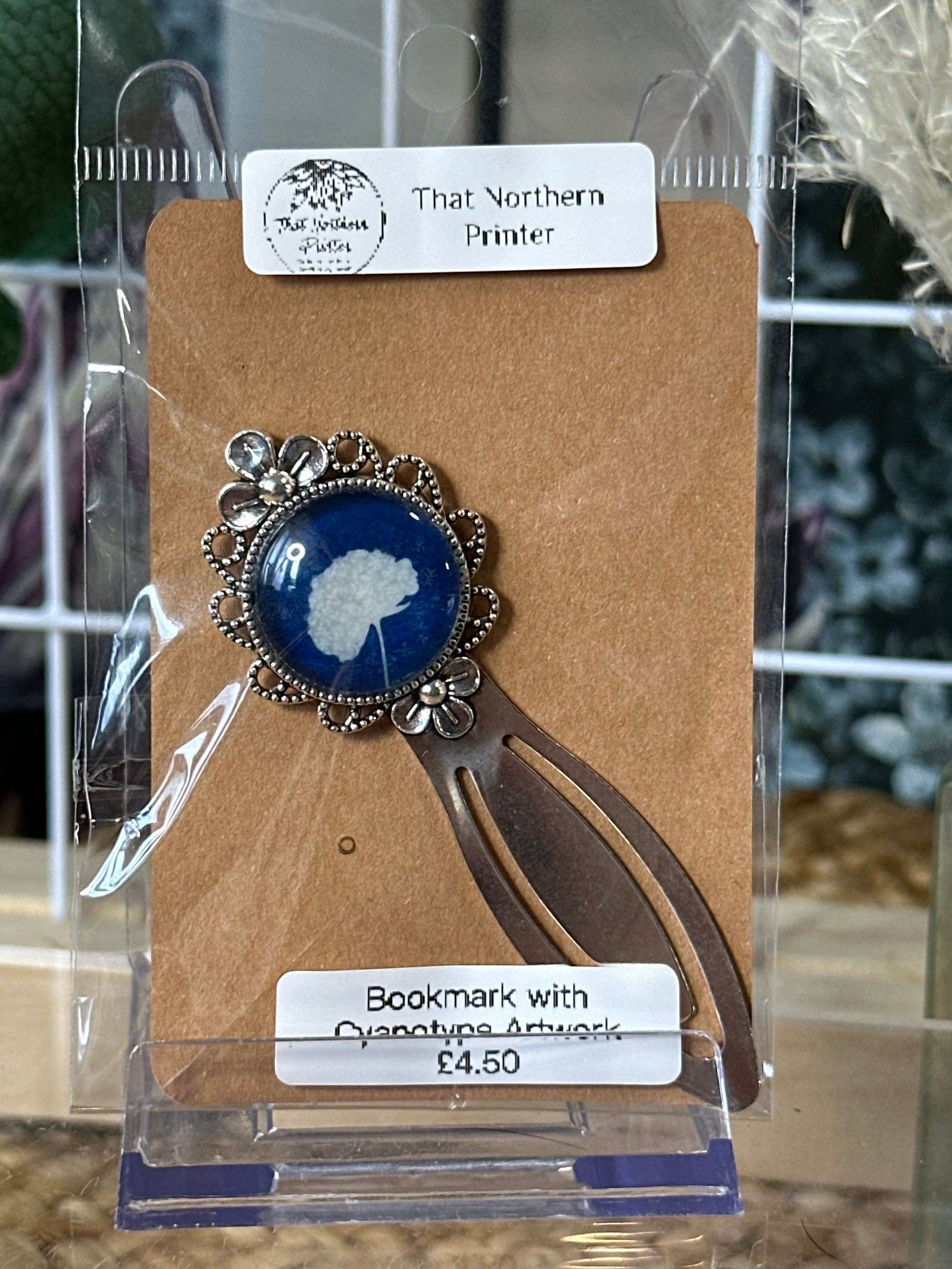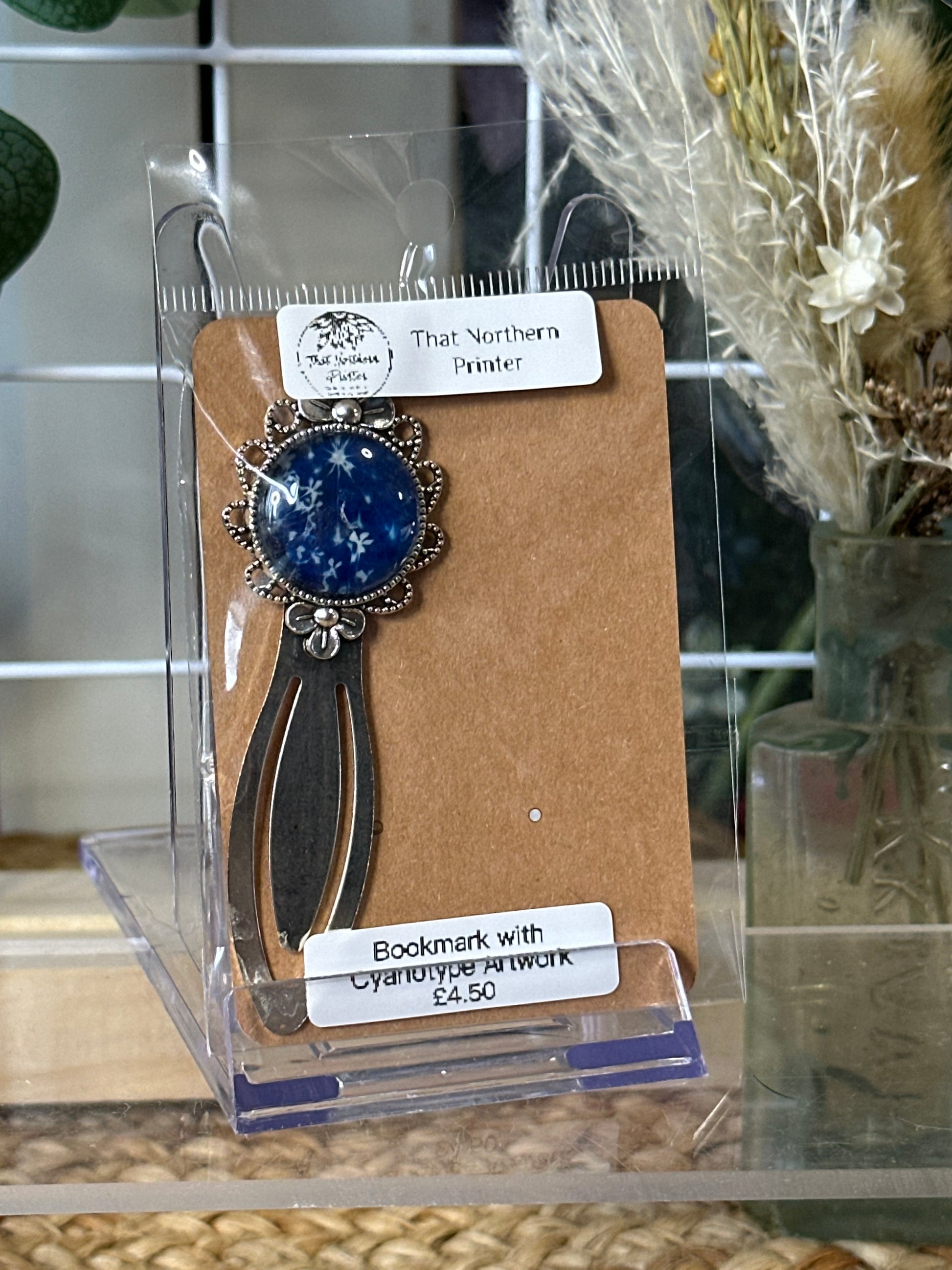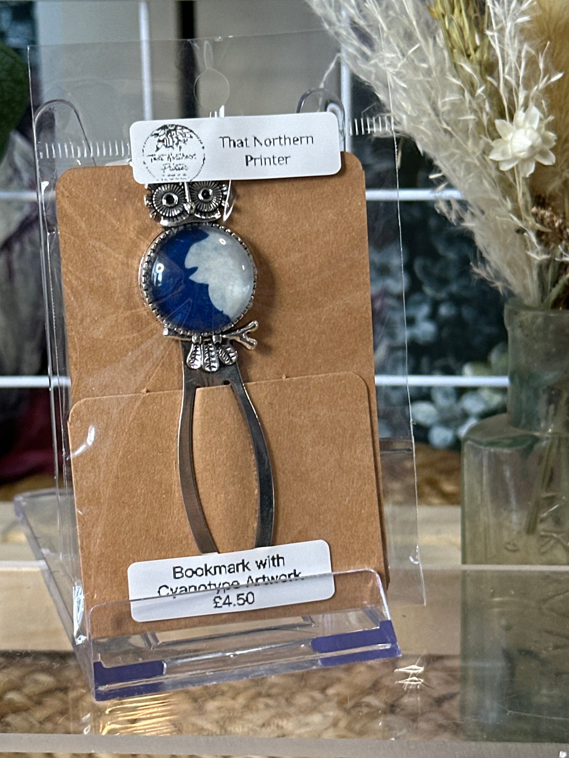 These handmade bronze-tone bookmarks feature a small round cabochon glass setting that holds an original cyanotype artwork. Each piece captures the soft blue tones and organic marks unique to the cyanotype process, making every bookmark completely one of a kind.