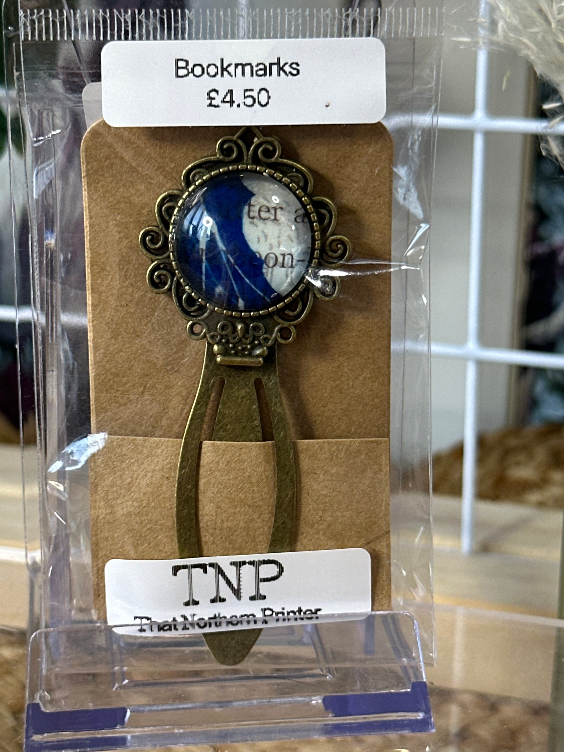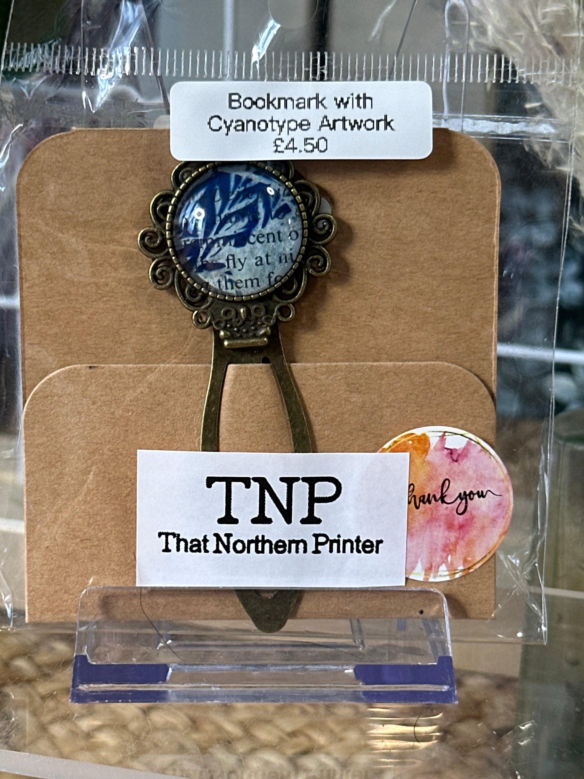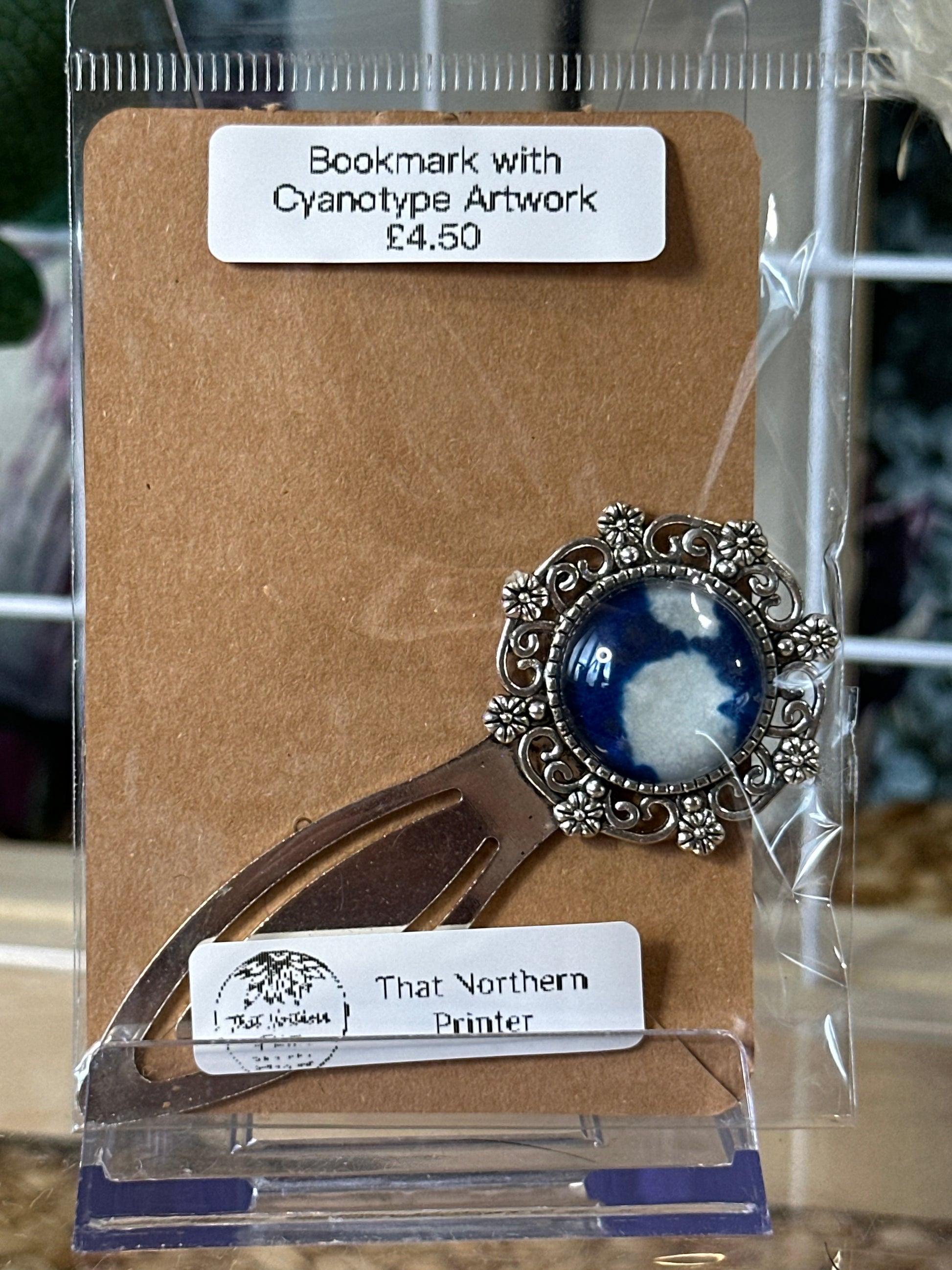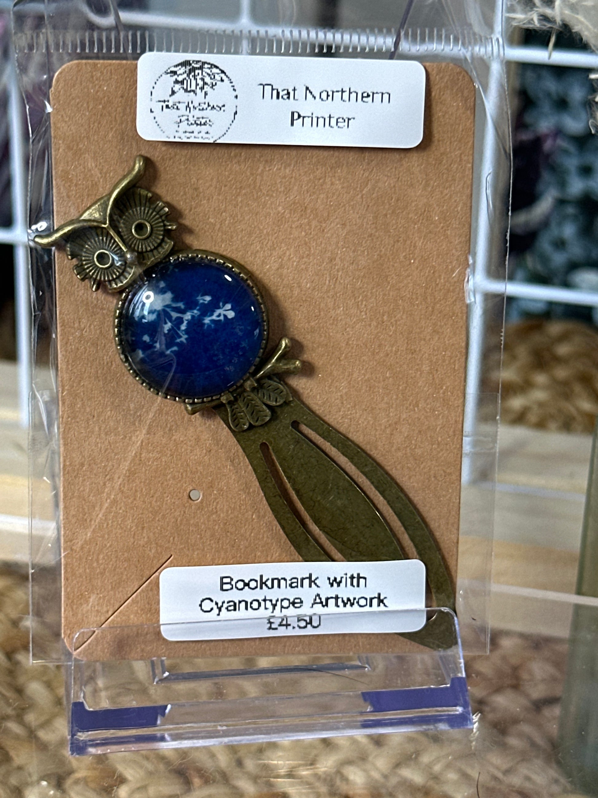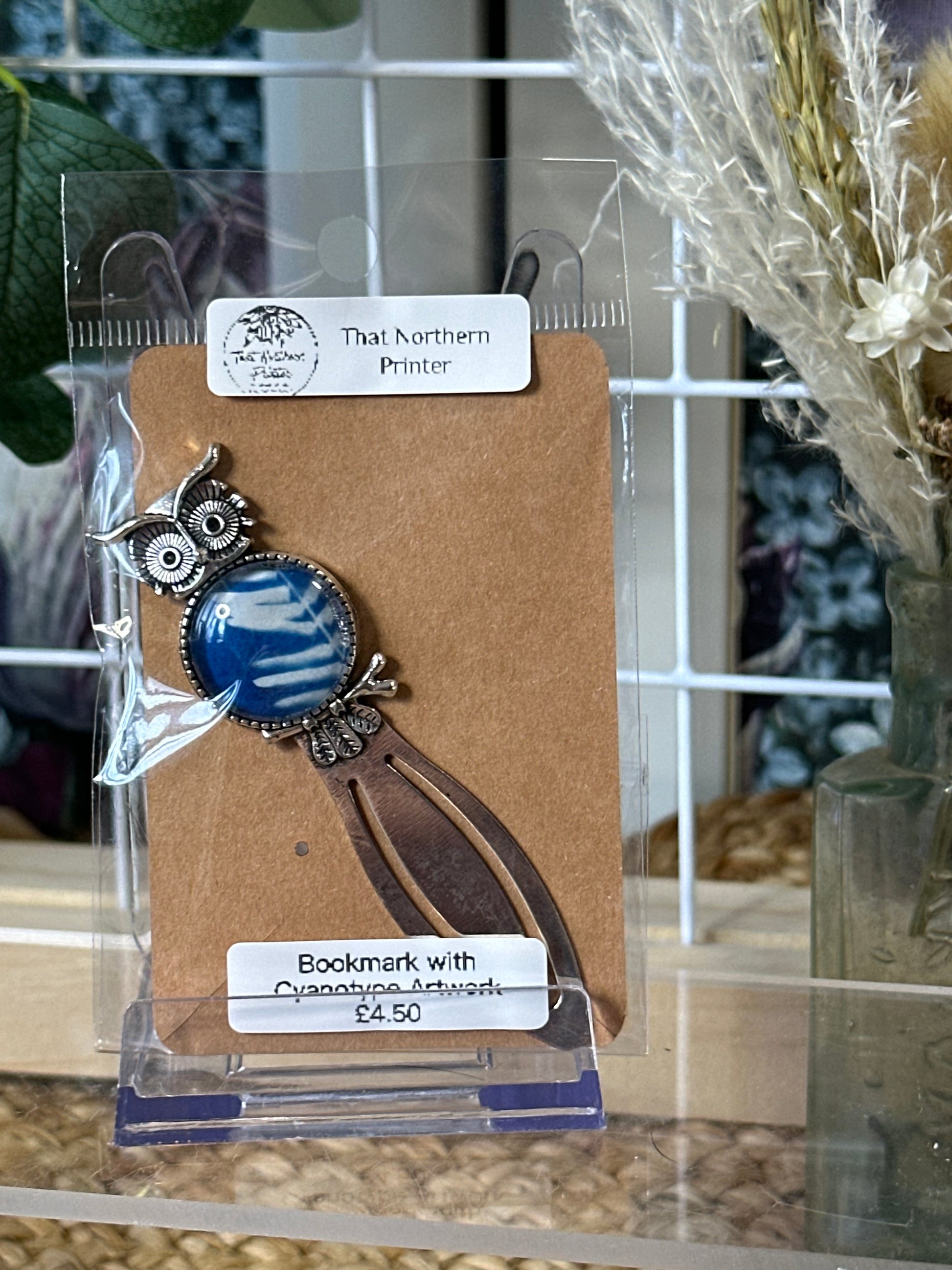 These handmade bronze-tone bookmarks feature a small round cabochon glass setting that holds an original cyanotype artwork. Each piece captures the soft blue tones and organic marks unique to the cyanotype process, making every bookmark completely one of a kind.