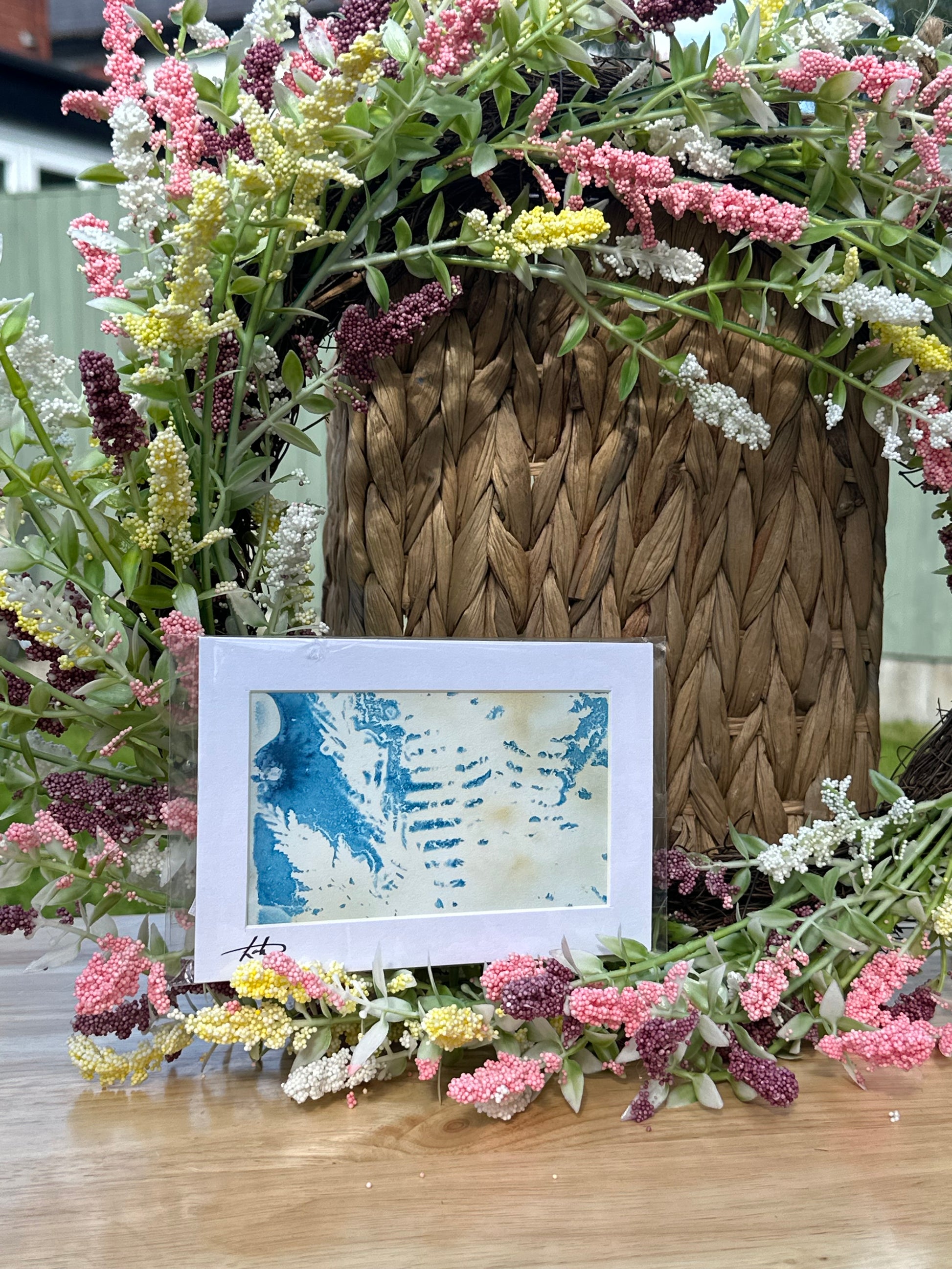 This is a one-of-a-kind original wet cyanotype print, created using pressed botanicals and the traditional cyanotype process. Measuring 6” x 4”, the piece captures delicate natural forms in rich blue hues, with subtle warmth added through hand-colouring with turmeric.