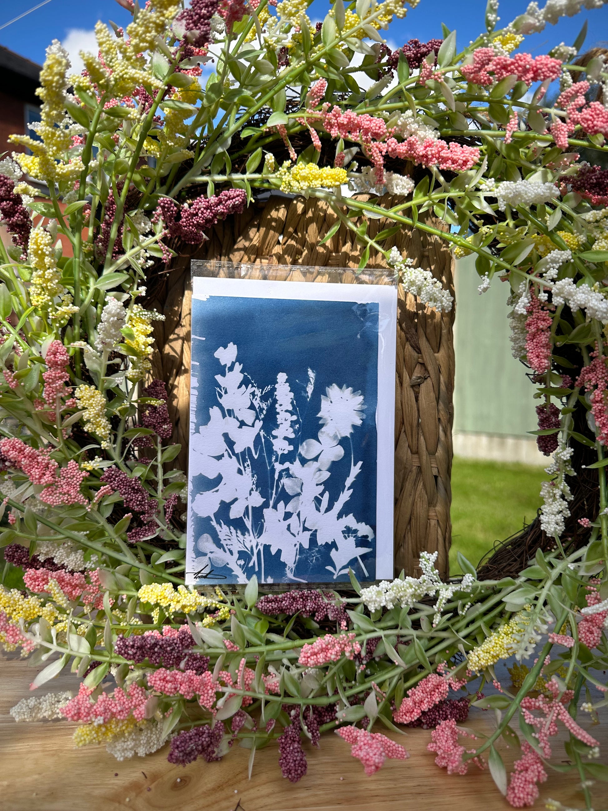 These cards feature a full cyanotype print across the entire front, each one an original artwork created using pressed and dried flowers. The deep blue tones of the cyanotype process bring out the delicate details of each botanical, making every card a unique piece.