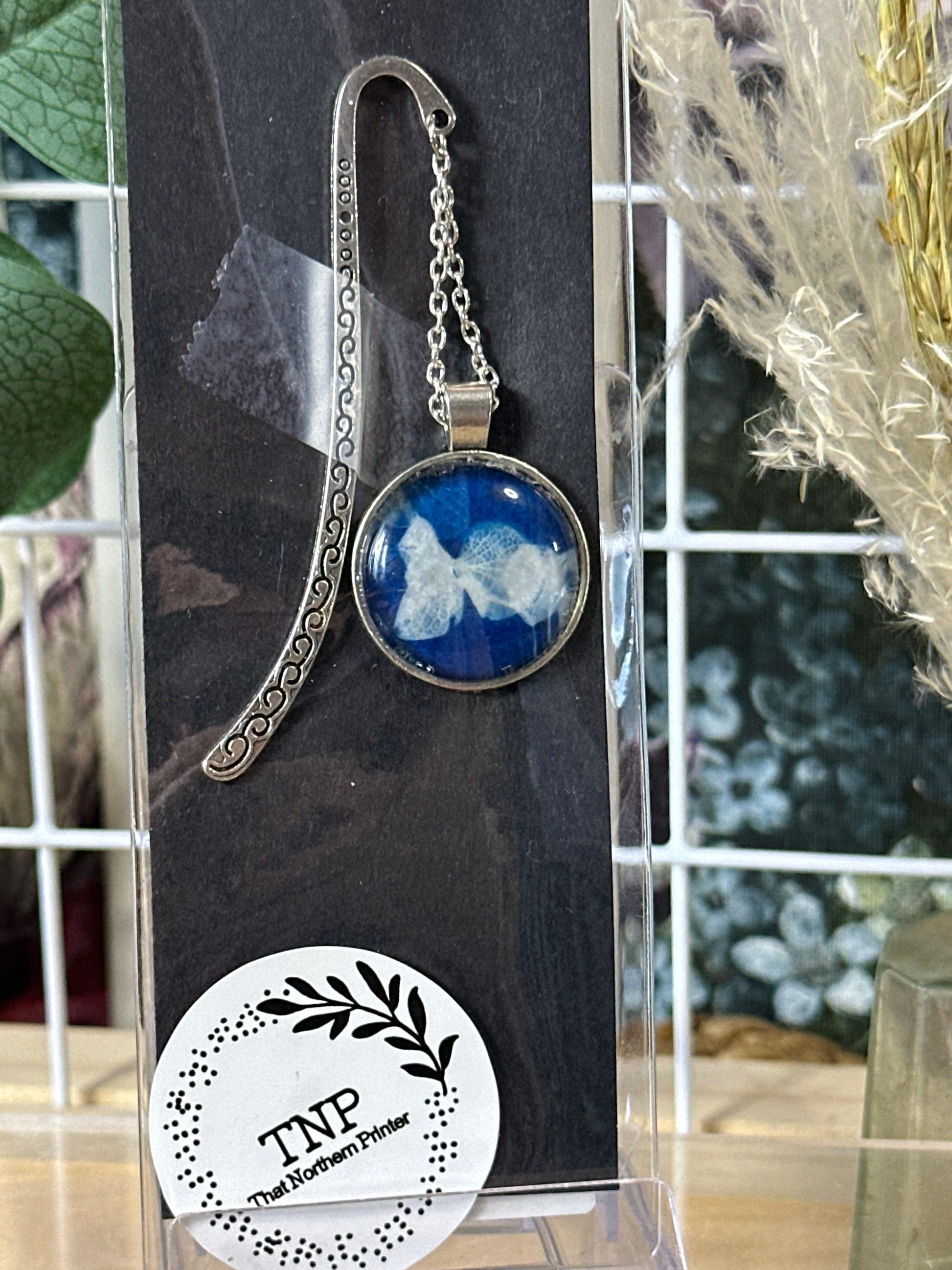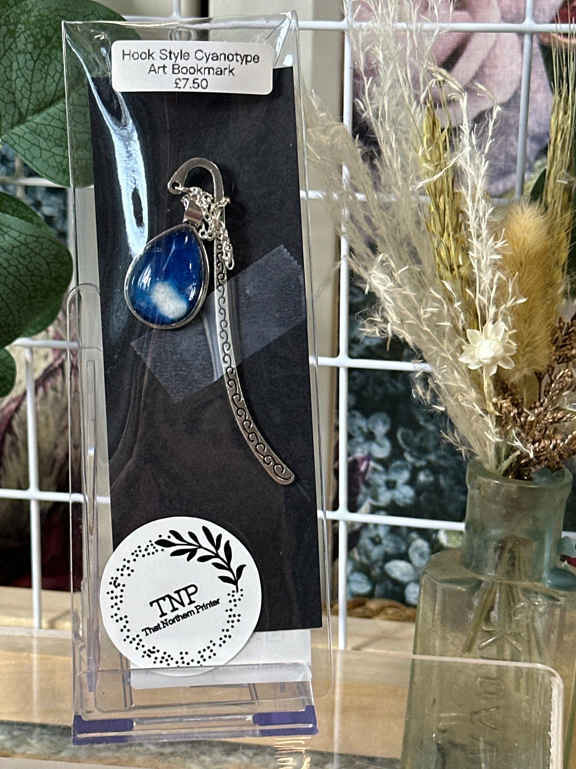 These handmade hook-style bookmarks are finished in a mix of silver and bronze tones and feature a small round glass cabochon holding an original cyanotype artwork. Each bookmark is carefully made in Lancashire and designed to sit neatly over the page, marking your place without slipping.
