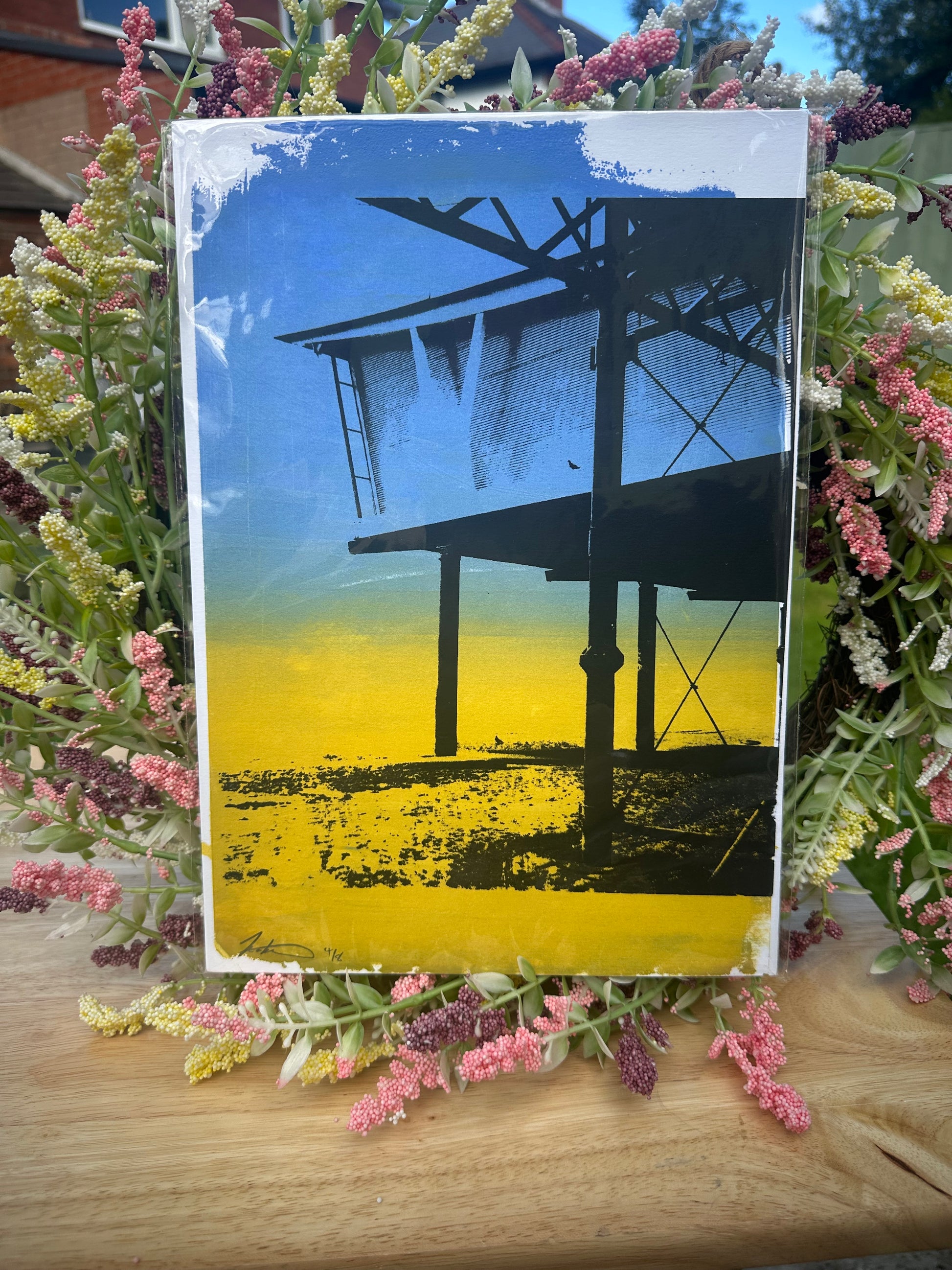 This monochrome screenprint captures the bold lines and stark contrasts of an industrial structure, transforming everyday architecture into striking graphic art. The sharp black-and-white palette gives it a contemporary feel, while the handmade process ensures each print carries its own subtle variations.