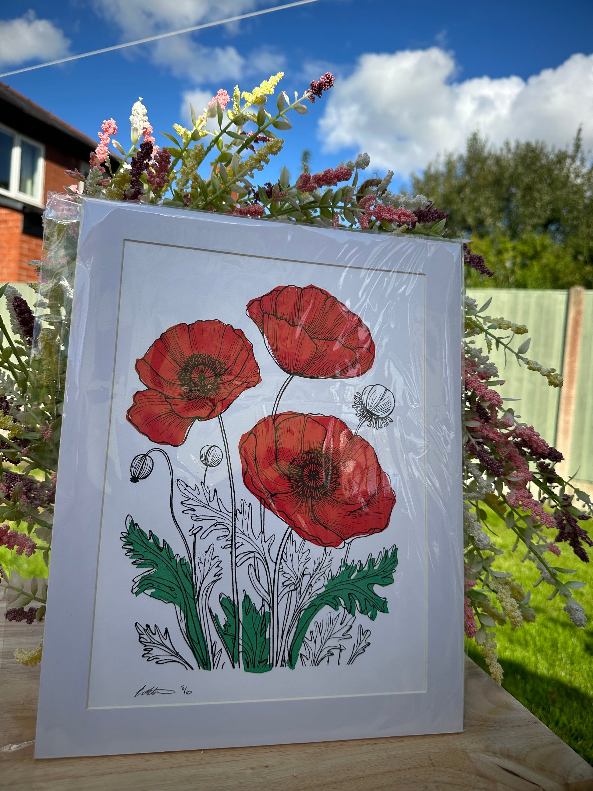 The artwork, titled “Poppies”, is built up through a process of layering soft, vibrant colour, followed by delicate black detailing to highlight the form and texture. The result is a striking yet simple composition that captures the natural beauty of these timeless flowers.