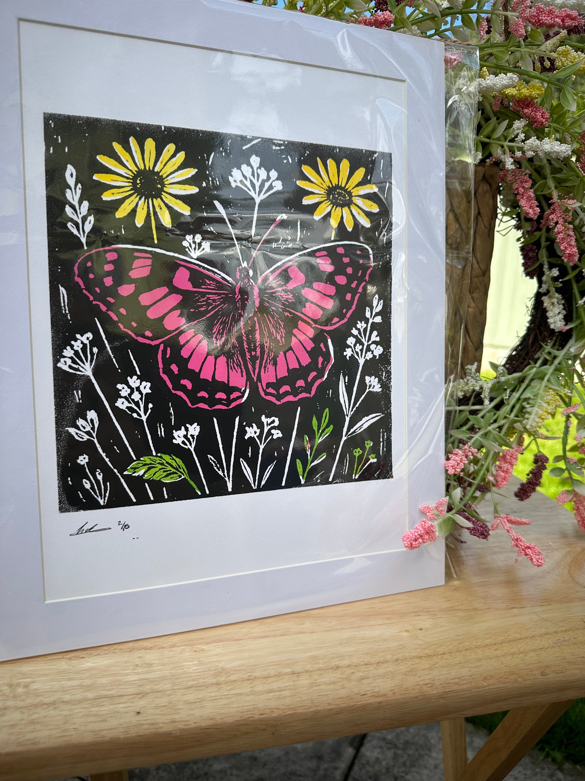This vibrant screenprint features a bold butterfly design in striking layers of black, pink, yellow, and green. Inspired by my own artwork and my wider botanical practice, the piece celebrates the harmony of nature and its ever-changing forms.